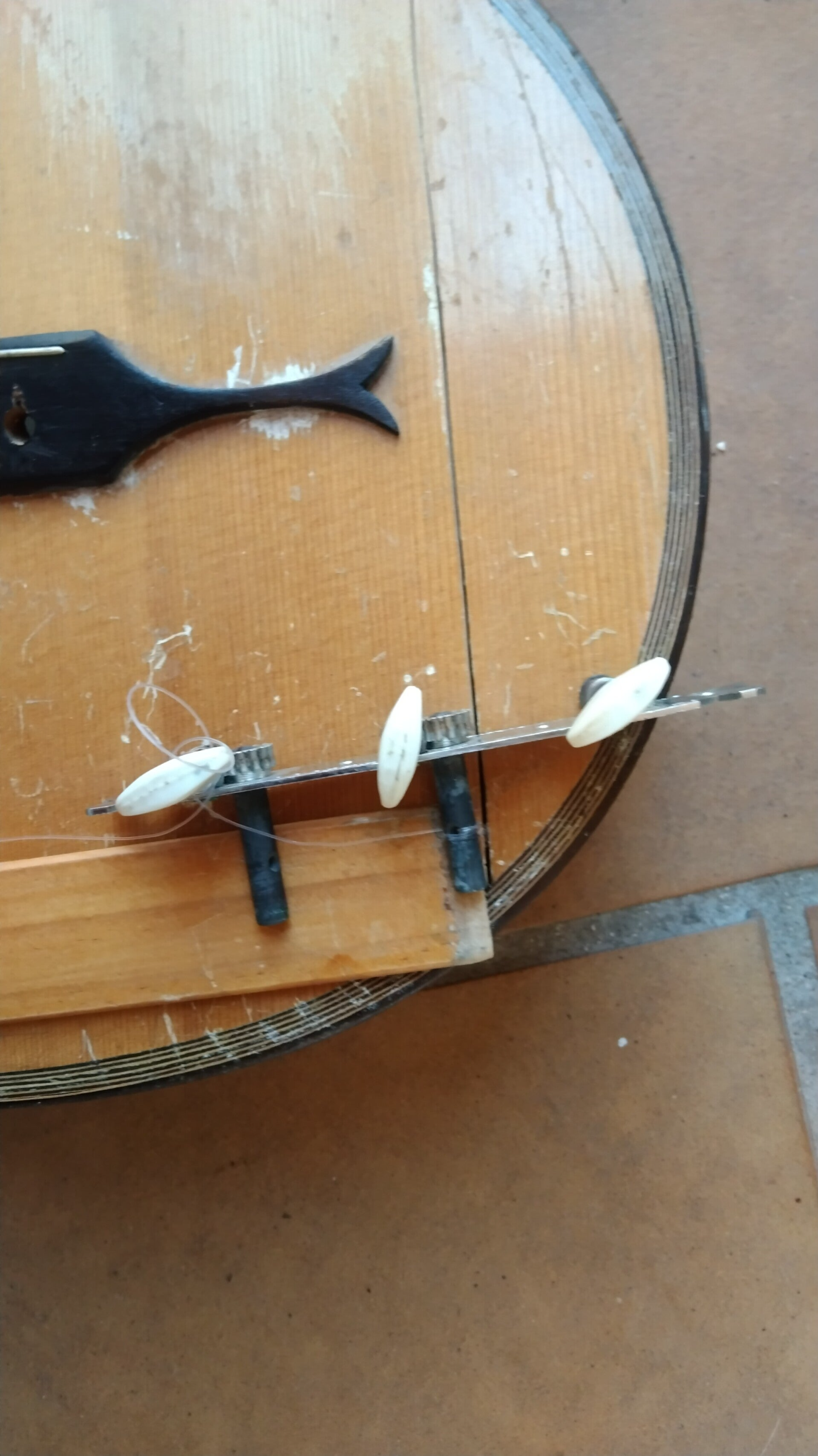 Pierrot. Guitarra romántica o de salón, posible construcción alemana de principios del siglo XX, además de múltiples grietas y golpes que en algunos casos han arrancado parte de la madera, presenta una enorme rajadura en la tapa, con la madera hundidas y varios tacos despegados, en la parte trasera las maderas están despegadas y deformadas, puente mal ajustado que la convierte en impracticable por la altura de las cuerdas, mástil y diapasón pintado de negro con pintura sintética.
