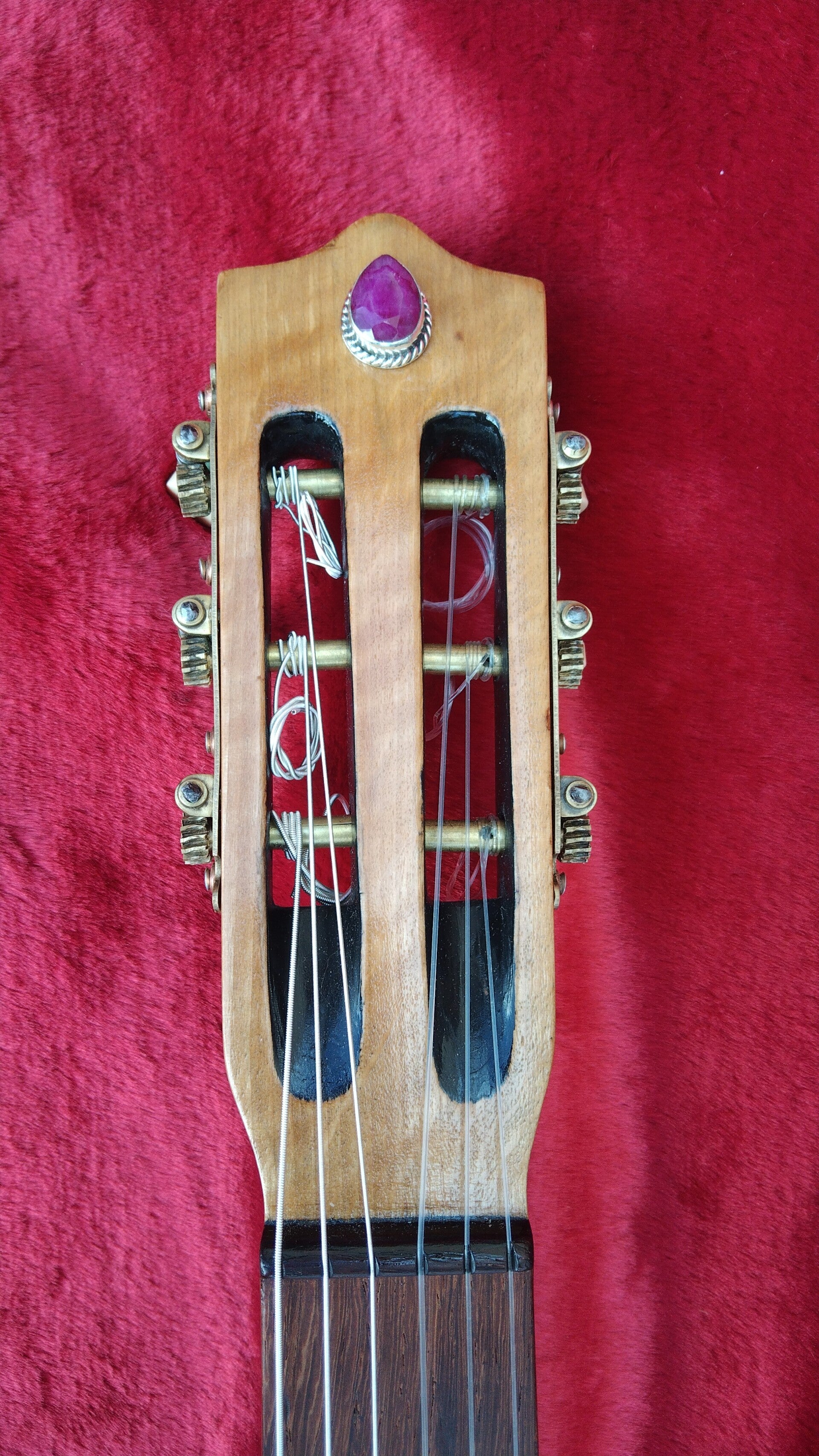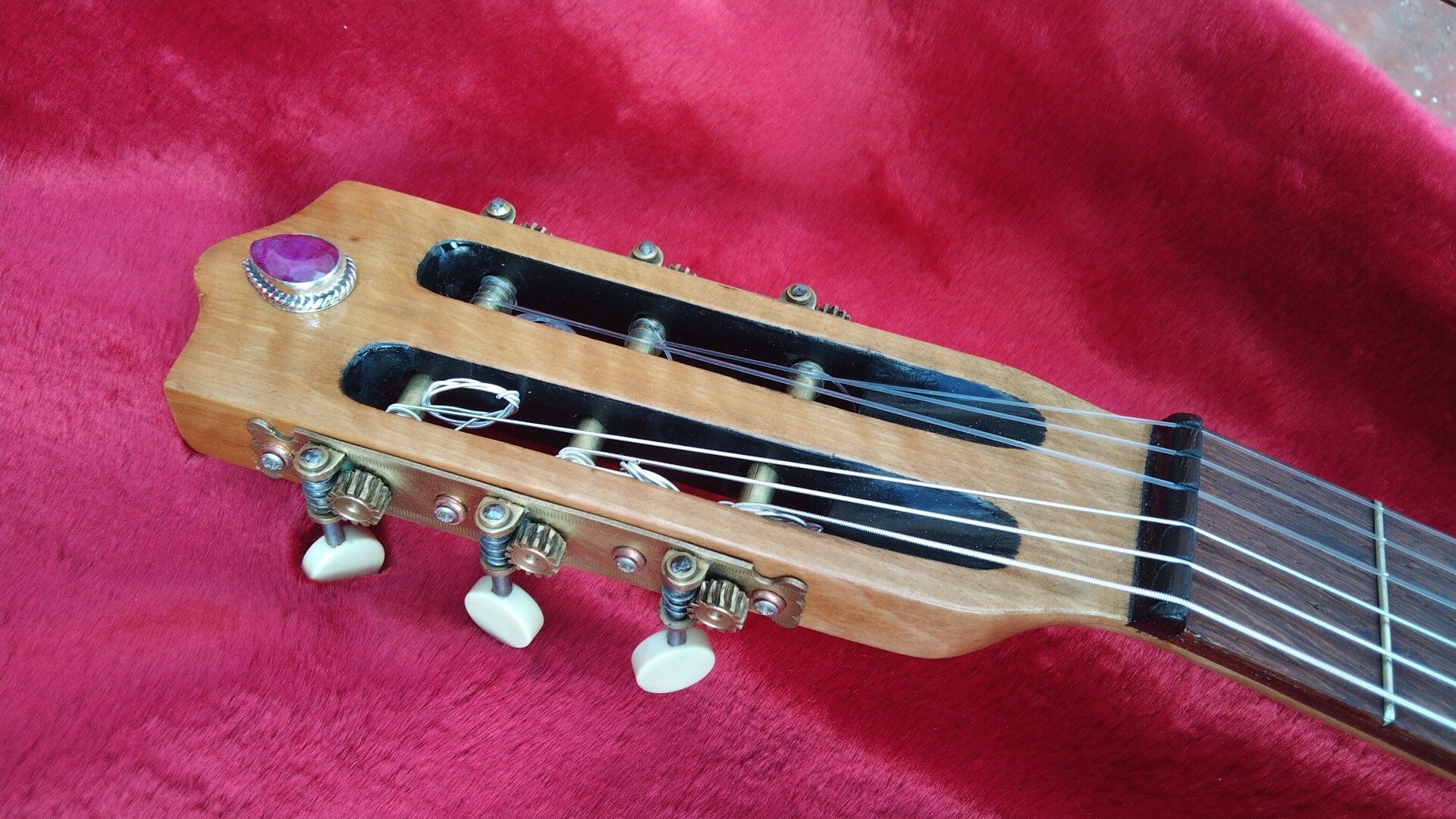 Retirada de todo resto de barniz y tinte, ajuste de diapasón y trastes, ajuste del puente adaptado a una altura de 2,5mm en el traste 12, colocación de roseta interior, elaboración y encolado de tacos de unión entre tapa y aros, incrustación entre las maderas del fondo, lágrima de rubí decorativa, acabado al aceite y goma laca estirada, cambio a cuerdas de carbono de alta tensión.